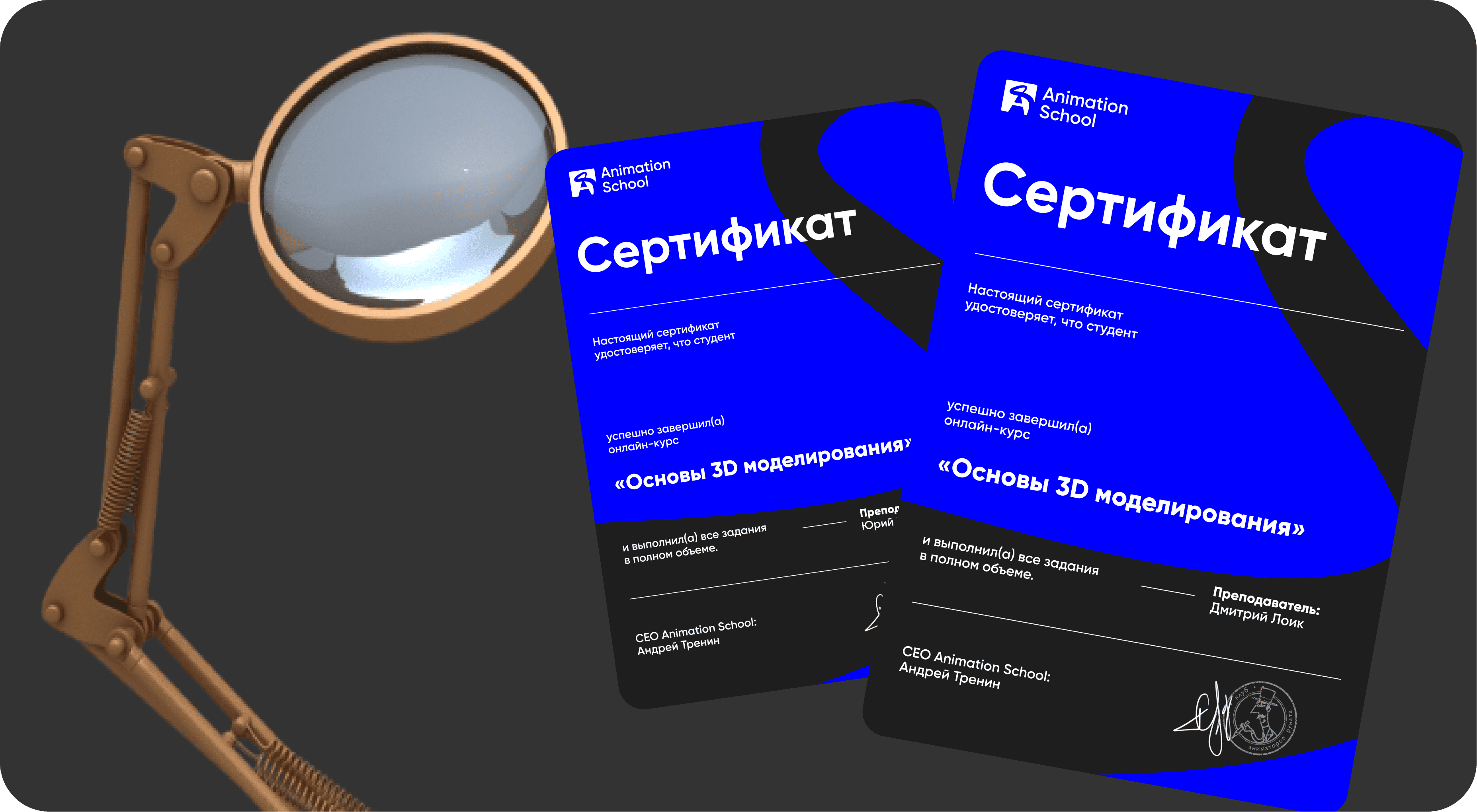 После успешного (сдачи всех предполагаемых курсом зачетов) завершения каждого курса, мы выдаем сертификат в электронном виде. Важно: это не диплом государственного образца, т.е. фактически, он не дает каких-то преимуществ. Мы делаем акцент на том, что во время обучения вы можете собрать портфолио, которое в сфере анимации имеет более весомое значение.