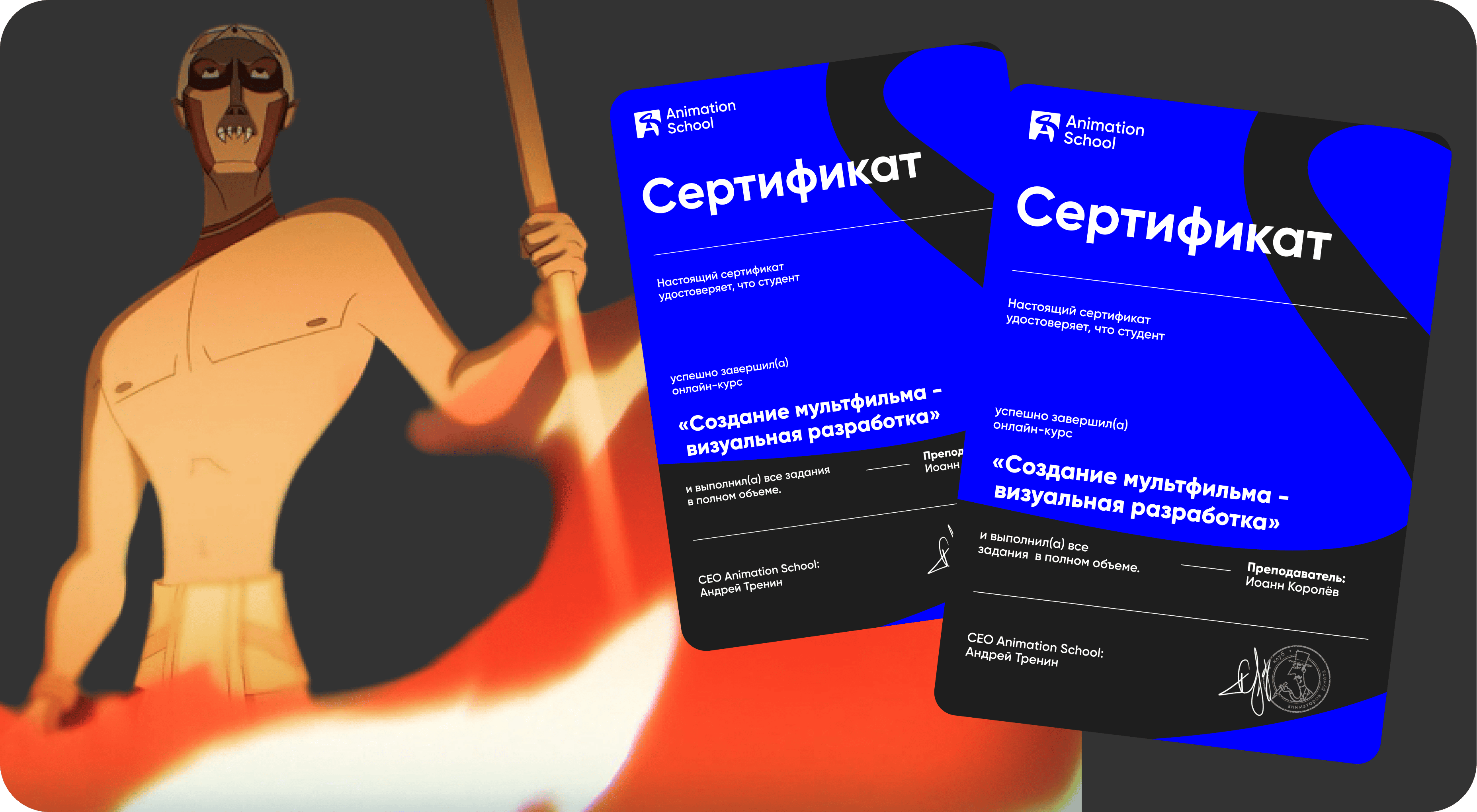 После успешного (сдачи всех предполагаемых курсом зачетов) завершения каждого курса, мы выдаем сертификат в электронном виде. Важно: это не диплом государственного образца, т.е. фактически, он не дает каких-то преимуществ. Мы делаем акцент на том, что во время обучения вы можете собрать портфолио, которое в сфере анимации имеет более весомое значение.